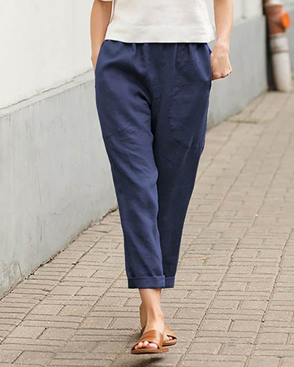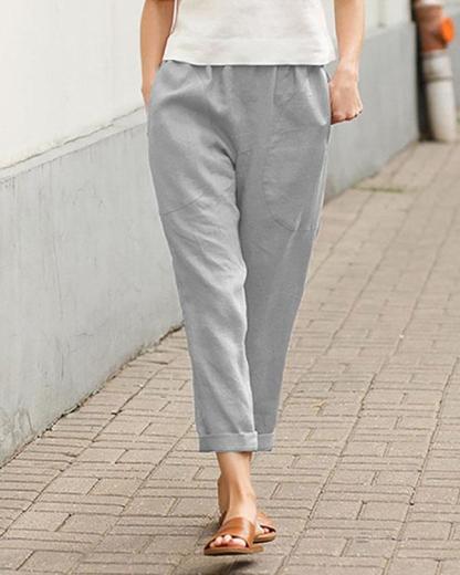 Casual Solid Pocket Elastic Waist Linen Pants